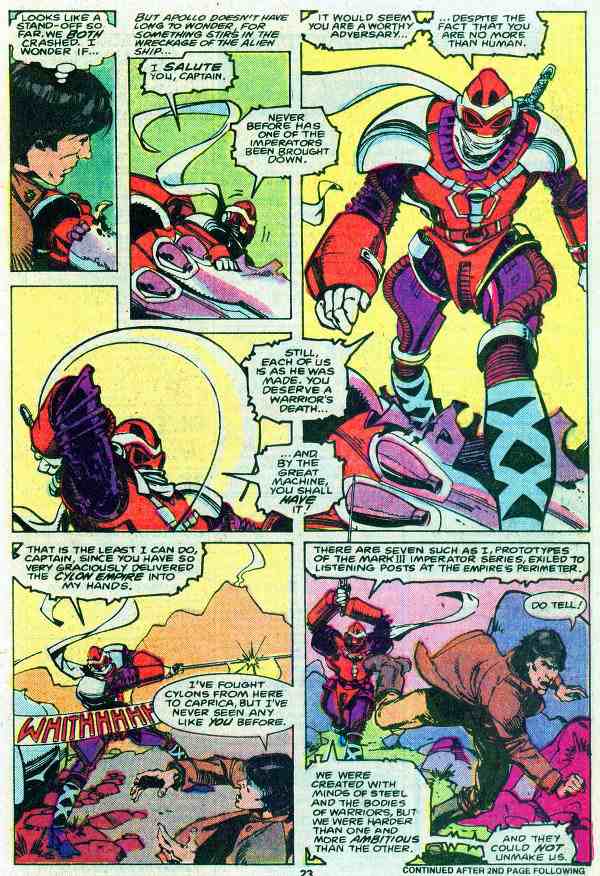 The later half of the Siminson stuff on Marvel Battlestar Galactica book,was better than anything the tv series was doing at the time.And this story gave us a Cylon equile to the Colonial Warriors-unlike the dumasses of the show.It was until Cye,showed in the last episode ''Return of Starbuck.''that we see a neat Cylon again.After that,the wait took some years until new series got underway.This comic not only had great art,it showed brains.We saw the Galactica doing some things never seen on tv and the vipers ,too.Sure,like one site say,it had a few flaws-like how Cylon Mark III survived the lava pit,when the other types wouldn't.But I guess McKenzie and Simonson was trying to show how tough these Cylons were.Too bad other comics and material didn't pick up on the Mark III Cylons.I'd love seeing them again.