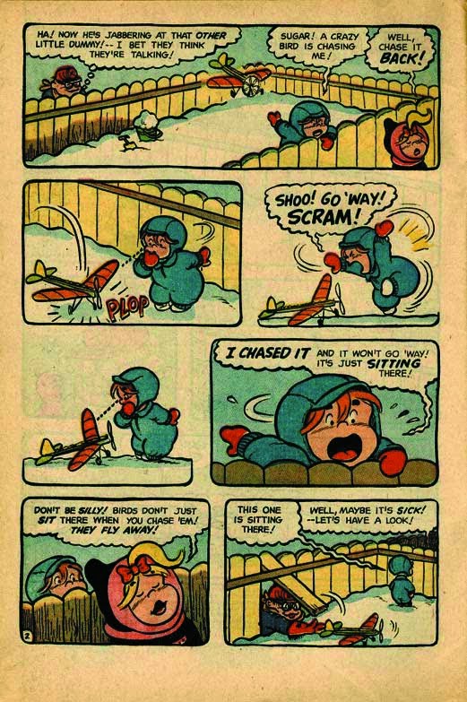 Seasons Greetings, Groove-ophiles! What's Christmas without kids and sweetness and snow and all of that good stuff? Not nearly as much fun! To make sure you get your prescribed daily intake of those necessities, here's a double-dose of Sheldon Mayer magic starring his signature creations Sugar and Spike! From Sugar and Spike #94 (December 1970), here's our cuddly couple taking on their nemesis Little Arthur in "Who Saw What?" followed by their first encounter with their new pal Raymond in "The Mixed-Up Mix-Up!" Flzzg Bvztpkfxq!*