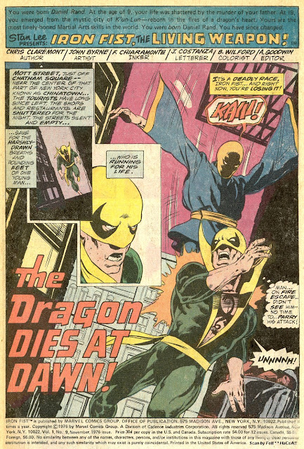 Here we go, Groove-ophiles! These are the first set of splash pages from the legendary Chris Claremont/John Byrne Iron Fist run (Marvel Premiere #25, July 1975; Iron Fist #'s 1-9, August 1975-September 1976). All you have to do is look at the energy, vitality, dynamicism, and storytelling that went into creating these Marvel-ous splash pages and you'll know why Mr. Byrne's star rose so quickly to super-stardom...