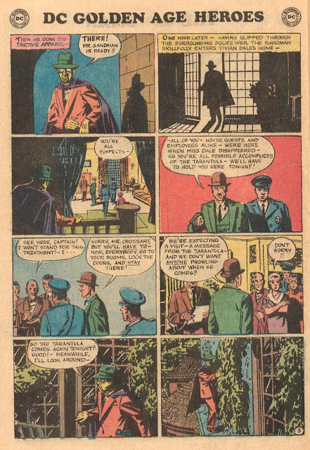 Young Groove flipped for this reprint of the first appearance of the original Sandman from Adventure Comics #40 as it appeared in Justice League of America #93 (September 1971). That suit/gas mask/fedora/cape combo looked so cool, and Bert Christman's (under the pen name of Larry Dean) art was so moody, man, it just grabbed me! Bet you'll dig it, too! Written by Christman and plotted by Gardner Fox, here's "The Tarantula Strikes!"
