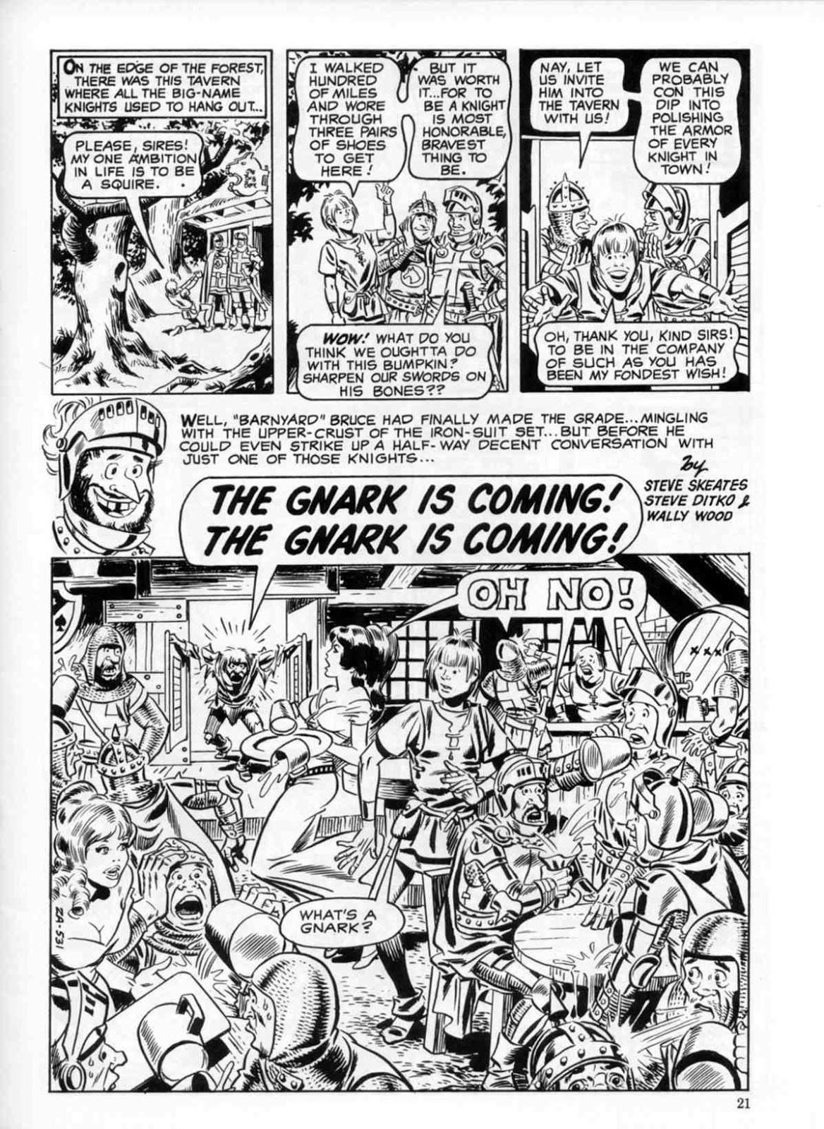 Hey, hey, hey, Groove-ophiles! Here's a mini-masterpiece of maniacal and macabre mischief by the super-team of Steve Skeates, Steve Ditko, and Wally Wood called "The Gnark Is Coming! The Gnark Is Coming!" This one was intended for an ish of Plop! but only saw the light of day (as far as I can discern) in Amazing World of DC Comics #13 (October 1976). Why would a story with such pedigree go unseen by only the most hardcore of DC fandom? Inquiring minds would like to know!