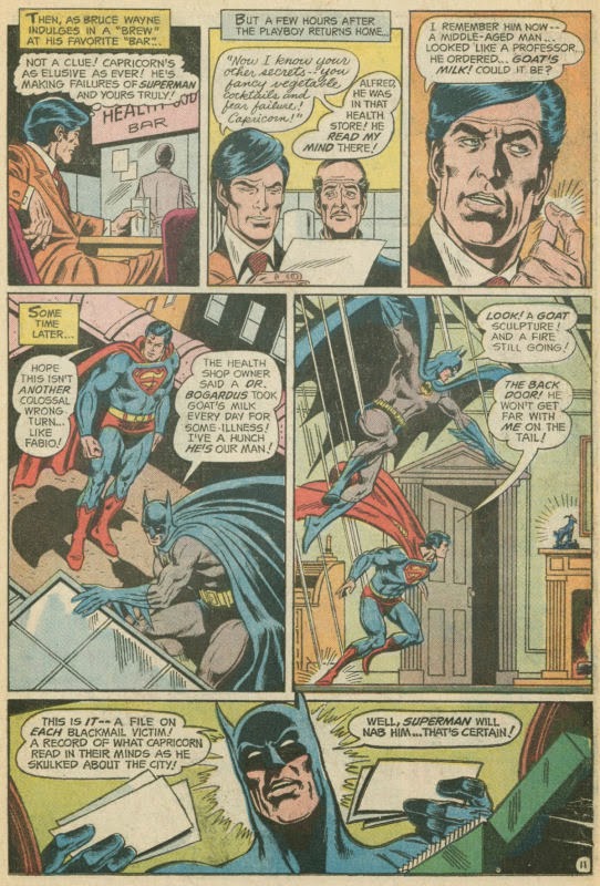 Dig, it, Groove-ophiles! Ol' Groove has dipped into the bag-o-requests from Ol' Groove's Request Line and pulled out a winner, courtesy artist (and Dave Cockrum fan) par excellence Jim Sanders, III! Among many other cool requests, Jimbo asked for "Who Is Capricorn?!" from World's Finest Comics #218 (April 1973)--and here it is! It's a tale only Bob Haney could tell, and the art is dyn-o-mite: Dick Dillin inked by Dave Cockrum! Oh, if only they'd gotten to team up for an ish of JLA or fifteen! Ah well, we do have this beauty (topped off by a Nick Cardy cover!)! Enjoy!