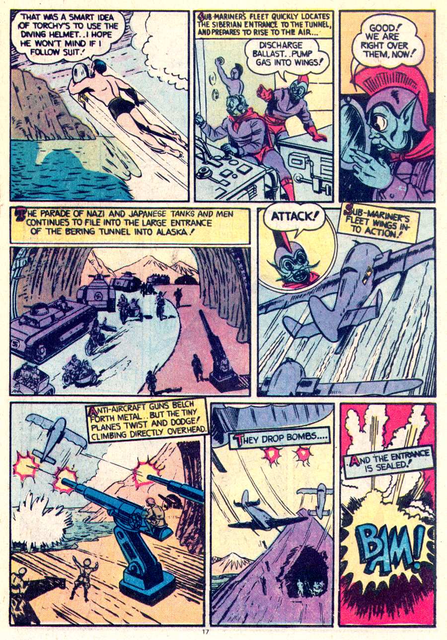 Greetings, Groove-ophiles! Ya know, back during the Groovy Age, the Dread Deadline Doom was an unwelcome visitor to many a Marvel mag. It always meant a reprint instead of a new adventure, and that, baby, was a big-time bummer. Usually. Sometimes, that reprint was something so cool that it actually made that reprint ish desirable. Case in point: Invaders #24 (October 1977) and "The Human Torch and the Sub-Mariner Fighting Side-by-Side!" Not only did we get a cool team-up, written and illustrated by two honest-to-Irving legends, Carl Burgos and Bill Everett...Not only did we get a feature length Golden Age tale featuring Marvel's two original heroes, Torchy and Subby, natch (sans 7 pages, thanks to comics 17 page ceiling at the time--which was stretched to 19 pages just this once)...But we learned that this was the very first "Marvel Team-Up" (though Marvel was Timely back in 1941)! How cool is that! Stick that bad-boy under a Gil Kane/Frank Giacoia cover, and you have thirty-five cents worth of WOW!!