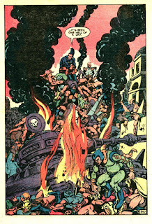 Check it out, Groove-ophiles! The final chapter of Jim Starlin's OMAC revival from Warlord #39 (August 1980)! "Battle Cry" (with finishes/inks by Romeo Tanghal) is an all-out action epic with two full-page splashes of piled-up and piled-upon warriors.