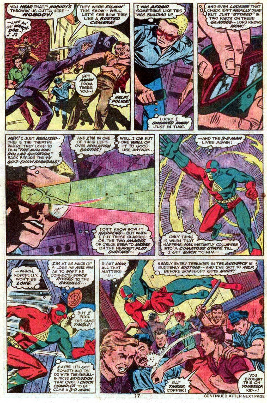 The interiors of Marvel Premiere #37 (May 1977) were again penciled by the great Jim Craig and inked by Dave Hunt! Of course, our tale was written by rascally Roy Thomas! This issue we get some great battle scenes as 3-D Man battles none other than the Cold Warrior! This tale has it all! Skrulls! Commies! The Cold Warrior, and even Tricky Dickie Vice President Nixon himself!!?? Where's the commie bustin' cop Officer Kirk when we need him! I always wondered if the 3-D Man had gotten his own solo series, would he have battled giant insects or the Blob? Met the 50's Captain America, Bucky, or the original Human Torch? OK I've rambled on here enough! Bust out your 3-D glasses and hop to it! AAhhh what might have been..... HHHmmmmm What If??? To be continued???